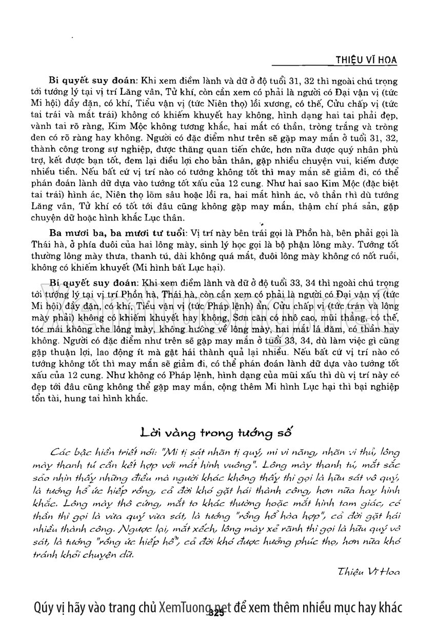 Sách "Tìm hiểu nhân tướng học theo kinh dịch" của tác giả Thiệu Vĩ Hoa cho chúng ta một cách nhìn toàn diễn về bản chất của thuật nhân tướng. Hầu hết chúng ta khi nói đến tướng thuật đều nghĩ đến khuôn mặt. Tuy nhiên như vậy có nghĩa là chỉ quan tâm đến phần hình dạng bên ngoài mà chưa chú trọng đến bản chất bên trong của thuật nhân tướng. Tướng thuật là nhìn tướng một người mà đoán được tuổi thọ, tài lộc, vận hạn... của họ, thậm chí của tổ tiên, cha mẹ, anh chị em trong gia đình người đó.