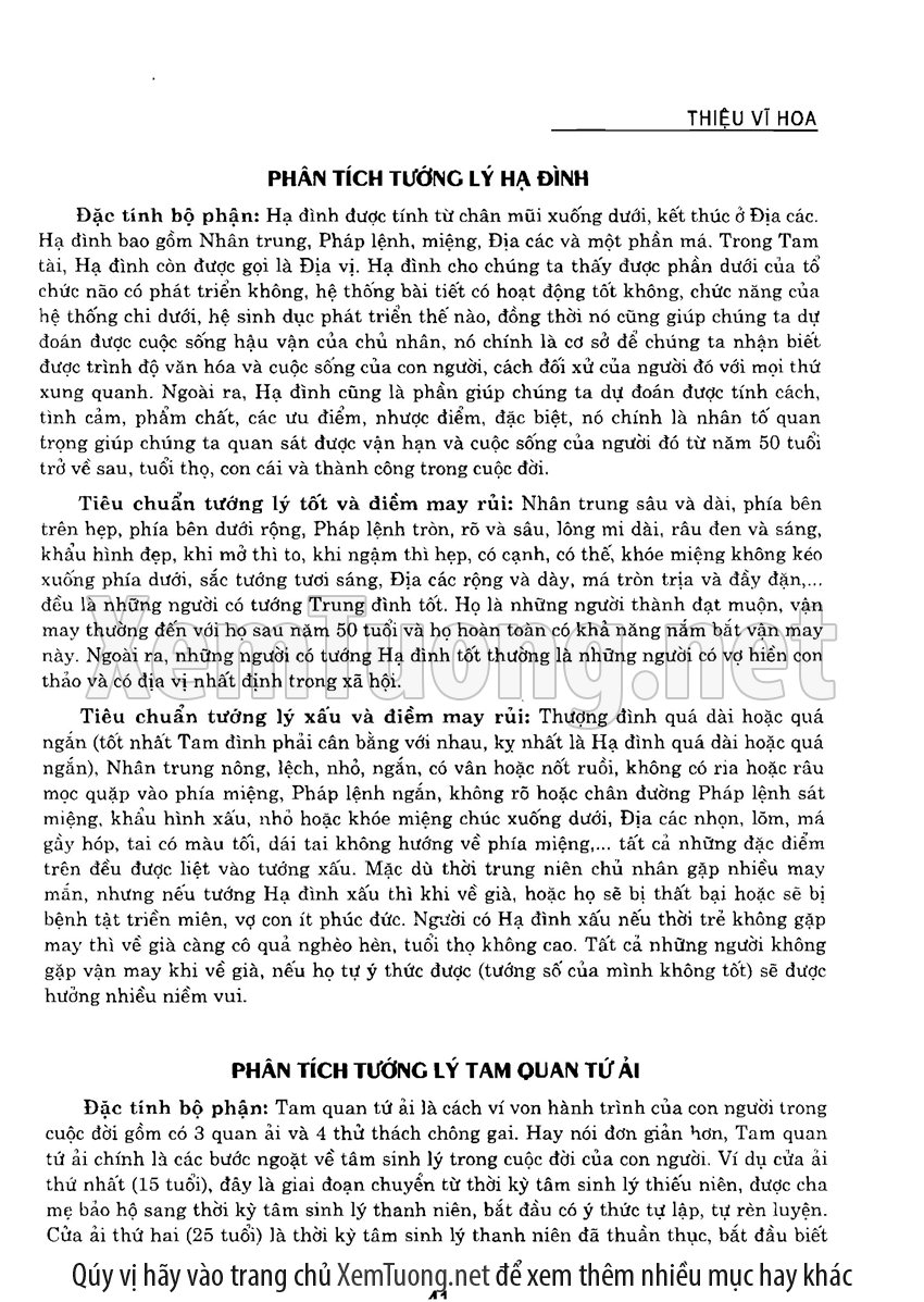 Sách "Tìm hiểu nhân tướng học theo kinh dịch" của tác giả Thiệu Vĩ Hoa cho chúng ta một cách nhìn toàn diễn về bản chất của thuật nhân tướng. Hầu hết chúng ta khi nói đến tướng thuật đều nghĩ đến khuôn mặt. Tuy nhiên như vậy có nghĩa là chỉ quan tâm đến phần hình dạng bên ngoài mà chưa chú trọng đến bản chất bên trong của thuật nhân tướng. Tướng thuật là nhìn tướng một người mà đoán được tuổi thọ, tài lộc, vận hạn... của họ, thậm chí của tổ tiên, cha mẹ, anh chị em trong gia đình người đó.