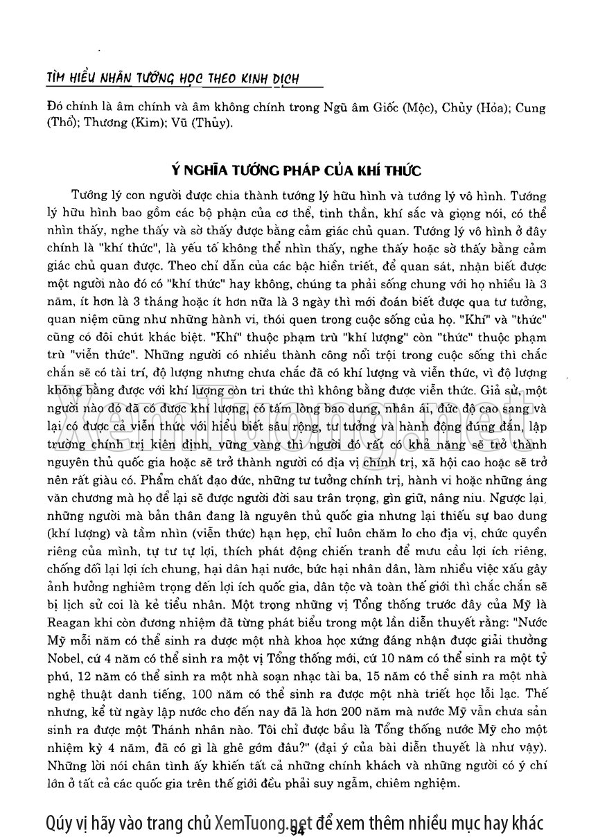 Sách "Tìm hiểu nhân tướng học theo kinh dịch" của tác giả Thiệu Vĩ Hoa cho chúng ta một cách nhìn toàn diễn về bản chất của thuật nhân tướng. Hầu hết chúng ta khi nói đến tướng thuật đều nghĩ đến khuôn mặt. Tuy nhiên như vậy có nghĩa là chỉ quan tâm đến phần hình dạng bên ngoài mà chưa chú trọng đến bản chất bên trong của thuật nhân tướng. Tướng thuật là nhìn tướng một người mà đoán được tuổi thọ, tài lộc, vận hạn... của họ, thậm chí của tổ tiên, cha mẹ, anh chị em trong gia đình người đó.