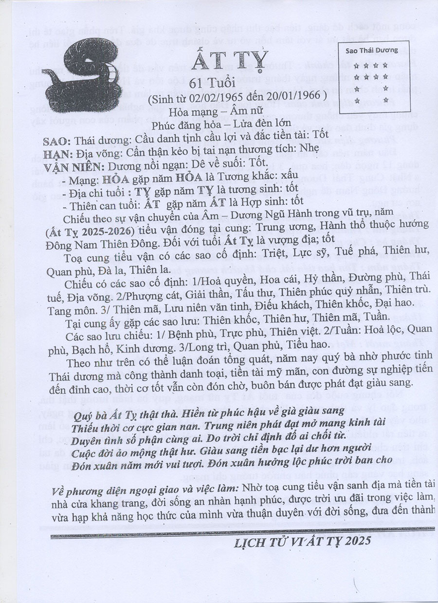 Có 3 phần xem tử vi năm Ất Tỵ 2025. Phần 1 là Thái Ất tử vi năm Ất Tỵ 2025 do Vương Dung Cơ (TQ) luận giải, Phần 2 do chùa Khánh Anh biên soạn, phần 3 là Tử Vi 12 tháng năm Ất Tỵ 2025. Qúy vị có thể chọn xem tất cả 3 phần rồi tổng hợp lại, những câu thường lập lại nhiều có khả năng sảy ra hơn.