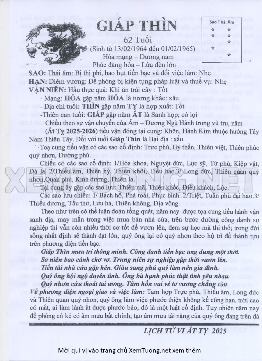 Tử Vi Năm Ất Tỵ 2025 mạng nam GIÁP THÌN