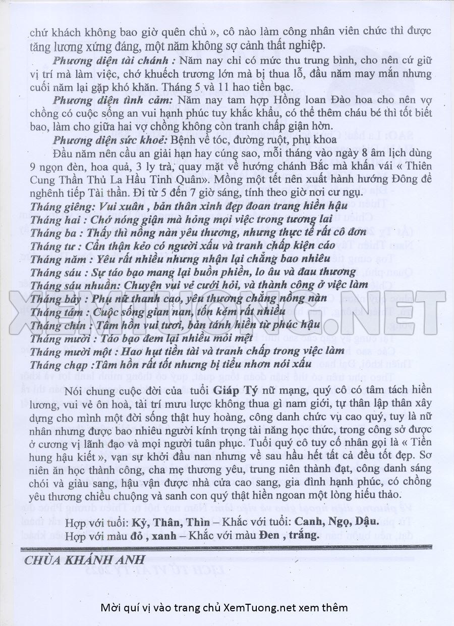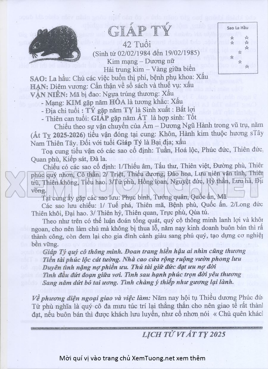 Tử Vi Năm Ất Tỵ 2025 mạng nữ GIÁP TÝ