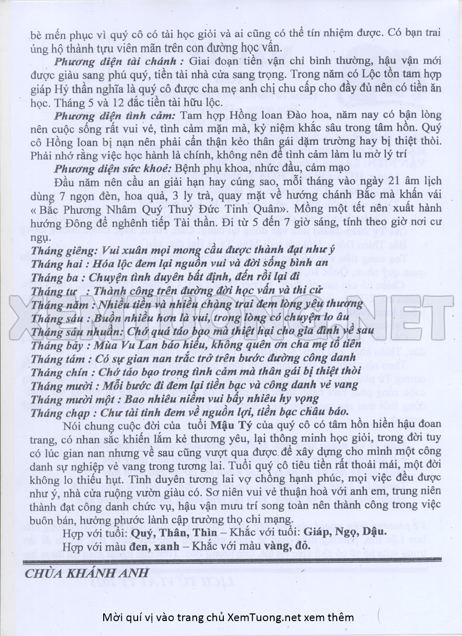 Tử Vi Năm Ất Tỵ 2025 mạng nữ MẬU TÝ