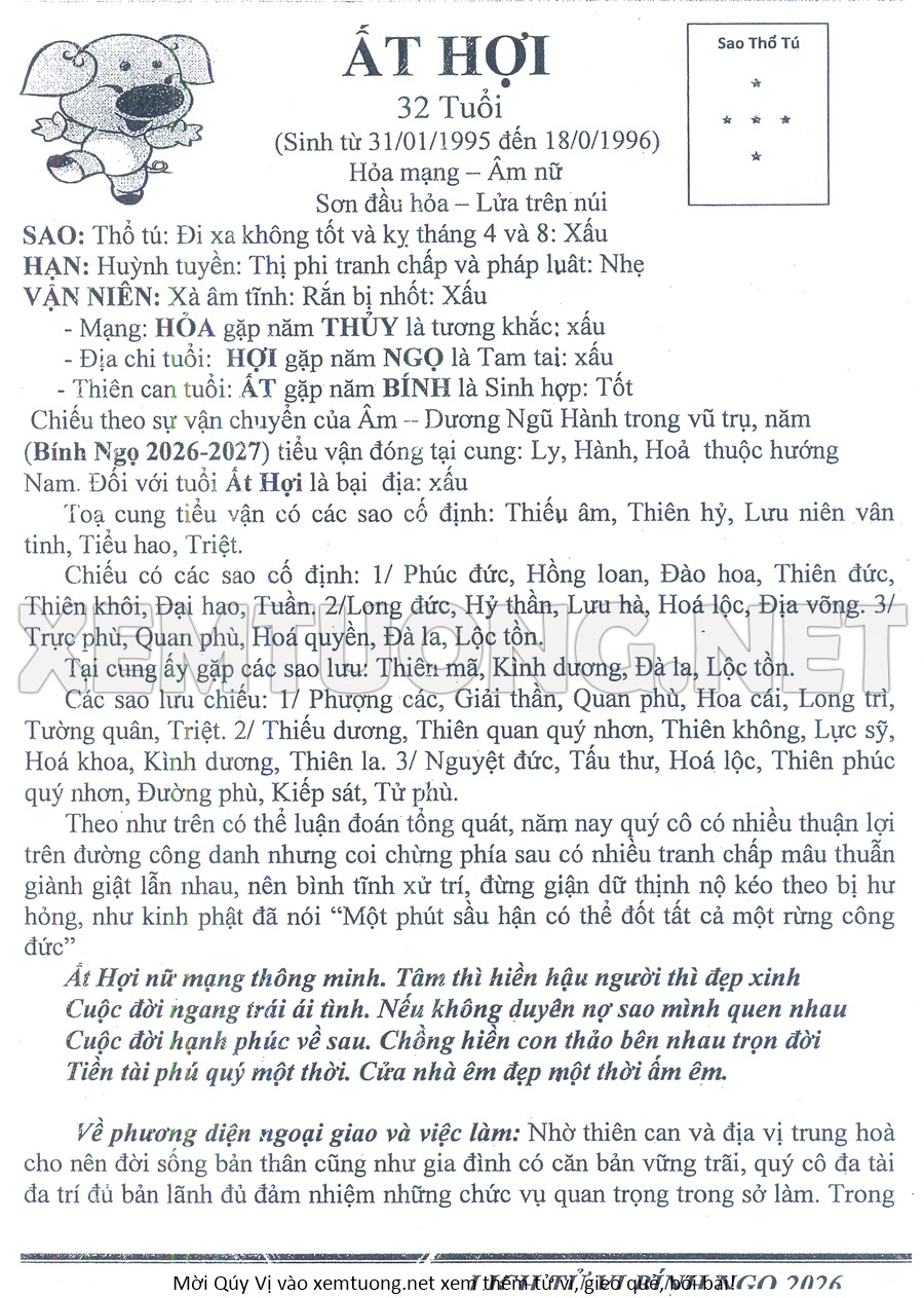 Tử Vi Năm Bính Ngọ 2026 mạng nữ ẤT HỢI