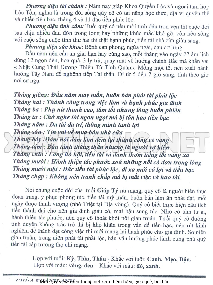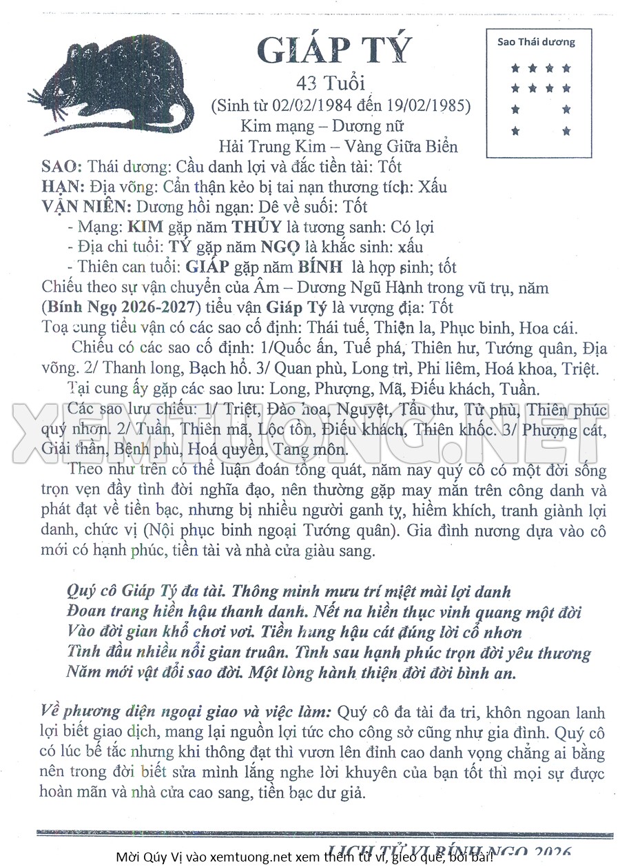 Tử Vi Năm Bính Ngọ 2026 mạng nữ GIÁP TÝ
