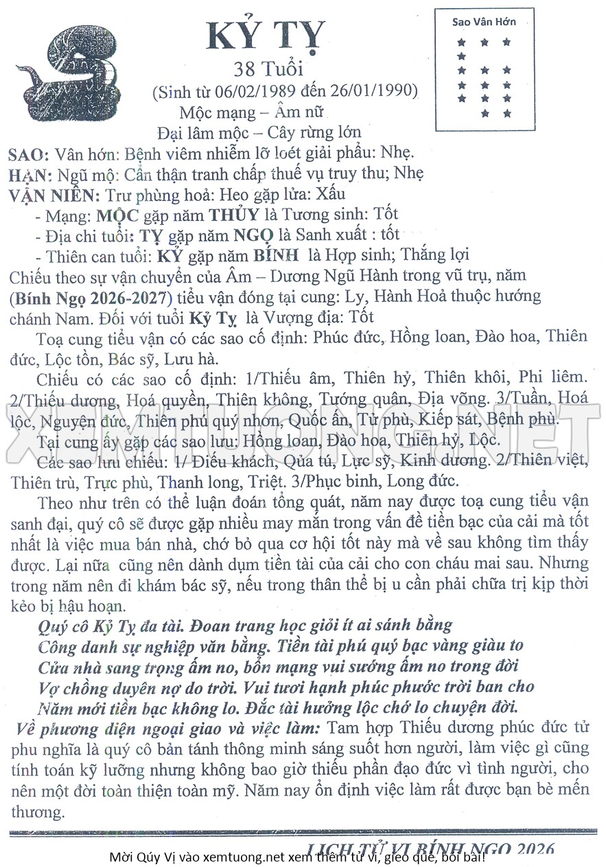 Tử Vi Năm Bính Ngọ 2026 mạng nữ KỶ TỴ
