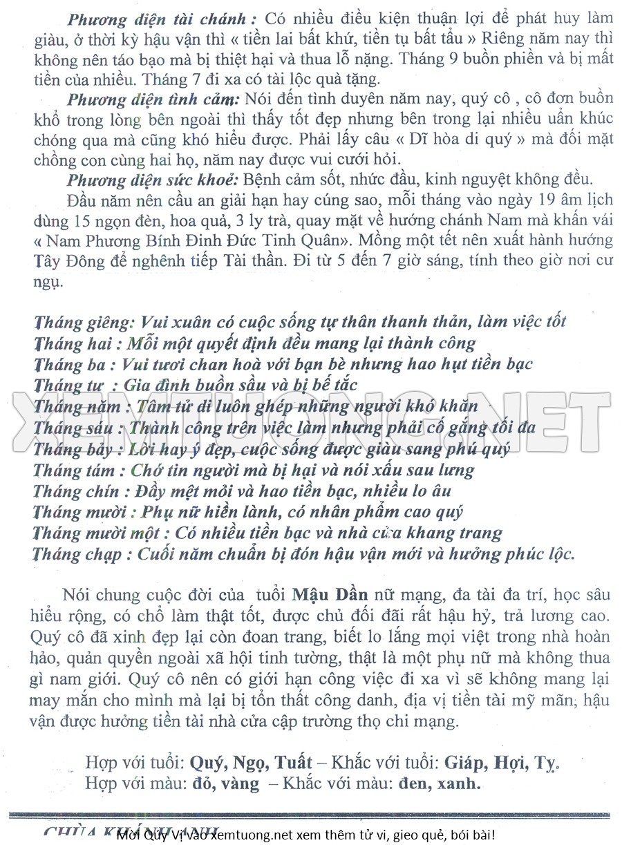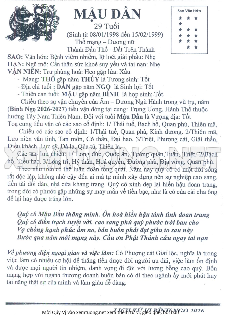 Tử Vi Năm Bính Ngọ 2026 mạng nữ MẬU DẦN