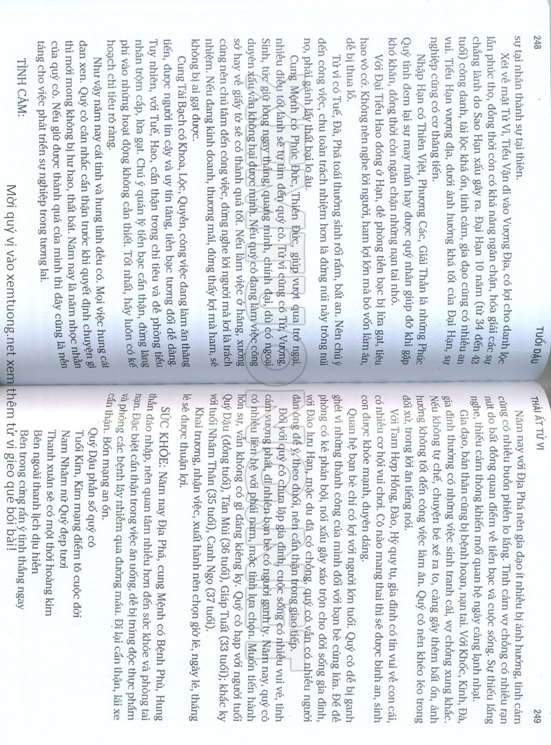 (Lưu ý: Thái Ất Tử Vi được chúng tôi scan từ sách, do đó mỗi tuổi sẽ có nhiều trang, quý vị xem xong hãy nhấn vào trang tiếp theo để xem hết phần tuổi muốn xem. Nếu quý vị xem bằng điện thoại thì hãy kéo qua lại để xem phần bị khuất.)